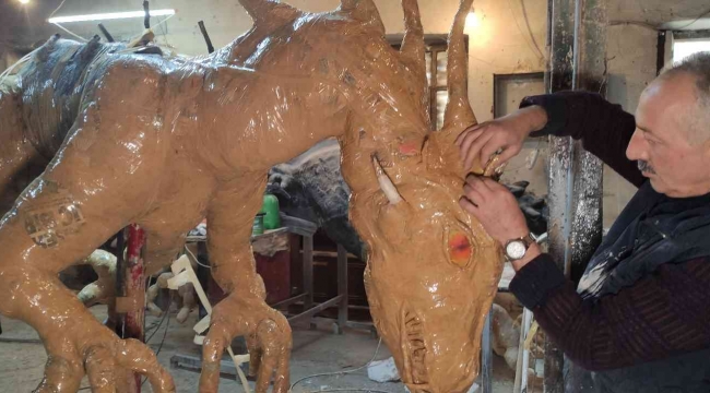 Bursa'da kalıp ustası hurda gazeteden 3,5 metre uzunluğunda ejderha maketi yaptı gören gerçek sanıyor.