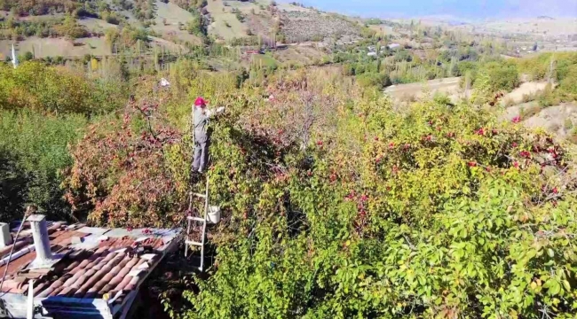 Amasya'da 90 yaşına merdiven dayayan Ahmet Aydoğan elleriyle diktiği metrelerce yüksekteki elma ağaçlarına merdivenle tırmanıp en üst basamakta meyve topluyor.