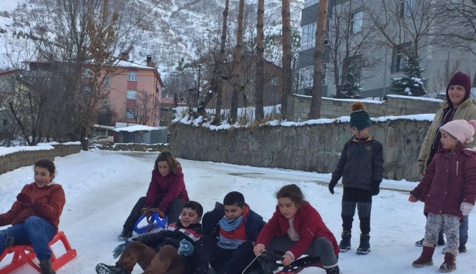 Kış mevsiminin çetin geçtiği yerlerden biri olan Tatvan’da geçtiğimiz günlerde etkili olan kar, büyükler için çileye dönüşürken çocukların ise yüzünü güldürüyor. Kısıtlamanın olmadığı saatlerde eline kızak, bidon ve poşeti alan çocuklar, soluğu mahalle aralarında kayak pistine dönen sokaklarda alıyor. Zaman zaman büyüklerinde dahil olduğu çocukların eğlencesi ise eğlenceli görüntüler oluşturdu. Daha hızlı kaymak için tahtadan yaptıkları kızakların ayağına metal ve plastik takan çocuklar, defalarca tepeye tırmanıp daha hızlı inebilmek için birbirleriyle yarışıyor.