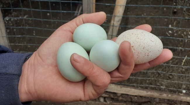 Çorum'un Osmancık ilçesinde yaşayan Ahmet Soluğan'ın çiftliğinde üretilen mavi renkli yumurtaları görenler şaşkınlığını gizleyemiyor.