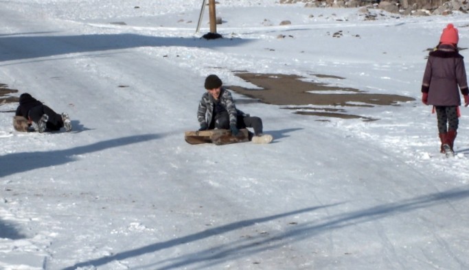 Ardahan’da kar yağışı sonrası etkili olan soğuk hava köylerde sokak ve caddelerin adeta buz pistine dönüşmesine neden oldu. Doğal kızak pistlerine dönüşen köy yollarında çocuklar düşe kalka kızak keyfi yaşarken, kar’ı eğlenceye dönüştürüyorlar.