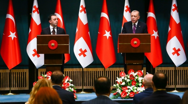 Cumhurbaşkanı Recep Tayyip Erdoğan, Gürcistan Başbakanı Irakli Garibashvili ile ortak basın toplantısı gerçekleştirdi. Gürcistan Başbakanı ve heyetini Ankara'da misafir etmekten memnuniyet duyduğunu ifade eden Cumhurbaşkanı Erdoğan, Türkiye'nin son 14 yıldır Gürcistan'ın en büyük ticari ortağı olduğunu vurguladı. Erdoğan, "Ticaret hacmimizde 2020'de daralma olsa da hedefimizi 3 milyar dolara ulaşma olarak belirledik. Serbest ticaret anlaşmamız kapsamının genişletilmesi amacıyla müzakerelerimizi sürdürüyoruz" dedi.