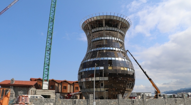 Rize'de inşaatı devam eden çay çarşısının camları takılmaya başlayınca dünyanın en büyük çay bardağı da kendini göstermeye başladı.Rize'nin sembolü çaydan yola...