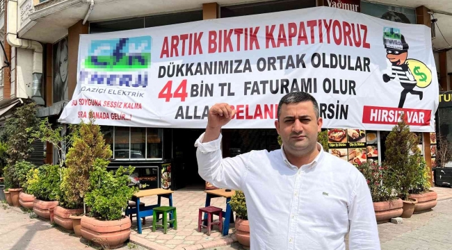 Esenyurt Süleymaniye mahallesinde bulunan bir kebapçı dükkanına gelen 44 bin TL'lik elektrik faturası sonrası iş yeri sahibi isyan etti. Duruma tepkisini iş yerinin ön cephesine, '44 bin TL fatura mı olur? Artık bıktık kapatıyoruz, hırsız var' yazılı pankart asarak gösteren esnaf, yetkililerden yardım istedi. 10 kişinin çalıştığı dükkânda elektriklerin kesildiğini söyleyerek iş yerini bugün itibariyle kapatıldığını dile getirdi.