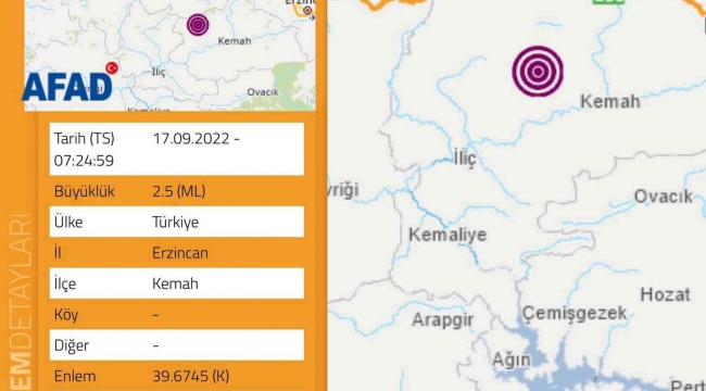 Afet ve Acil Durum Yönetimi Deprem Dairesi Başkanlığından alınan bilgiye göre, saat 07.24'de merkez üssü Erzincan'ın Kemah ilçesinde 2.5 büyüklüğünde yerin 6.84 kilometre derinliğinde bir deprem meydana geldi. Depremde herhangi bir can ve mal kaybı yaşanmadı.