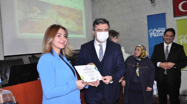 Projede yer alan firmalara katılım sertifikası verilirken Erzurum Kadın Kooperatifi Başkanı Zeynep Polat'da teşekkür belgesini Erzurum Valisi Okay Memiş'in elinden aldı.