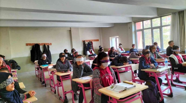 Liseli öğrenciler, 10-16 Mayıs Engelliler Haftası münasebetiyle farkındalık oluşturmak amacıyla iki ders saati boyunca gözleri kapalı bir şekilde ders işleyerek geçirdiler.