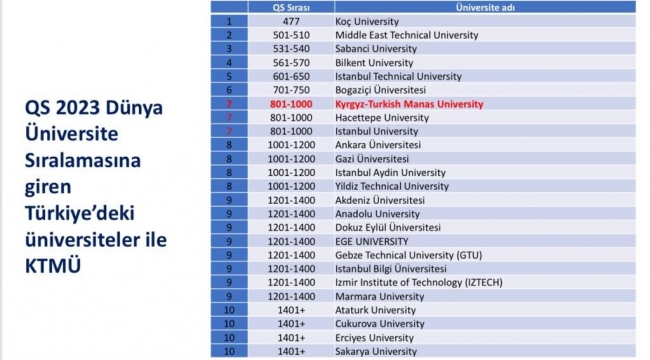 Kırgızistan-Türkiye Manas Üniversitesi, Türkiye'de faaliyet gösterip bu listeye giren 24 üniversite arasındaysa 7. sıraya yerleşti.