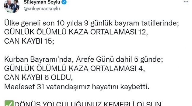 "Ülke genelinde son 10 yılda 9 günlük bayram tatillerinde günlük ölümlü kaza ortalaması 12, can kaybı 15; Kurban Bayramı'nda arife günü dahil 5 günde günlük ölümlü kaza ortalaması 4, can kaybı 6 oldu. Maalesef 31 vatandaşımız hayatını kaybetti. Dönüş yolculuğunuz kemerli olsun."