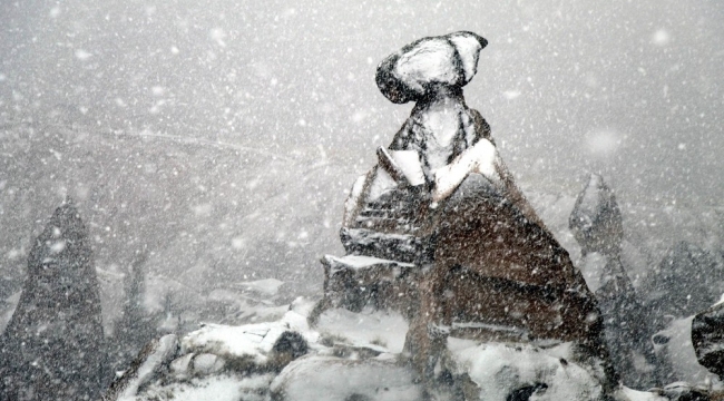 Türkiye'nin önemli turizm merkezlerinden Kapadokya bölgesinde bahar ayında yağan kar yağışı peribacalarını beyaza bürüdü. Karlar altında kalan peribacaları yerli be yabancı turistleri kendisine bir kez daha hayran bırakırken kar yağışı ile birlikte peribacaları kartpostallık görüntüler verdi.