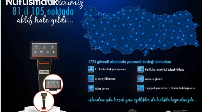 İçişleri Bakanlığı Nüfus ve Vatandaşlık İşleri Genel Müdürlüğü tarafından nüfus müdürlüklerinin iş yükünü azaltmak ve vatandaşların işlemlerini kolaylaştırmak amacıyla hayata geçirilen "Nüfusmatikler" ülke genelinde yaygınlaştırılarak, 81 ilde 105 noktada hizmet vermeye başladı.
