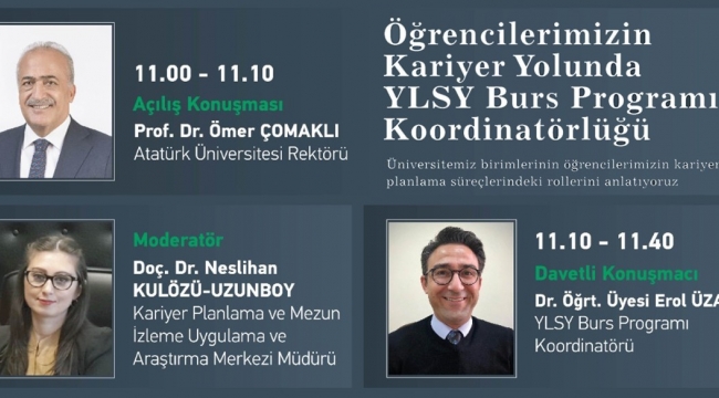 Öğrencilerin kariyerlerini şekillendirmeleri ve kendilerine en uygun yolu seçebilmelerine katkı sunmak amacıyla söyleşi programları düzenleyen Atatürk Üniversitesi Kariyer Planlama Mezun İzleme Uygulama ve Araştırma Merkezi (ATA KARMER) tarafından bu hafta, Yurt Dışına Lisansüstü Öğrenim Görmek Üzere Gönderecek Öğrencileri Seçme ve Yerleştirme (YLSY) Burs Programı Koordinatörlüğü ele alındı.