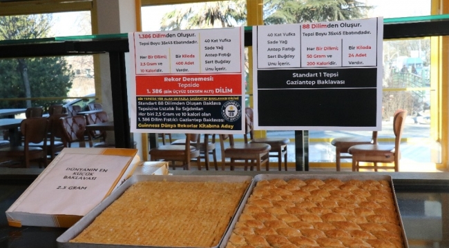 Baklavanın 40 kat yufkadan elde edildiğini dile getiren Gaziantepli tatlıcı Ahmet Özen, baklava dilimlerinin, kullanılan fıstık tanelerinden bile küçük hale getirerek hayalini gerçekleştirmenin mutluluğunu yaşıyor. 2 buçuk gram ağırlığında ve kalori değeri 10 olan minik baklava dilimleri diyet yapan insanların da ilgi odağı oldu. Standart 88 dilimden oluşan baklava tepsisine rekor denemesi için ustalık ile sığdırılan bin 386 dilim fıstıklı Gaziantep baklavası Guinnes Dünya Rekorlar Kitabına aday.