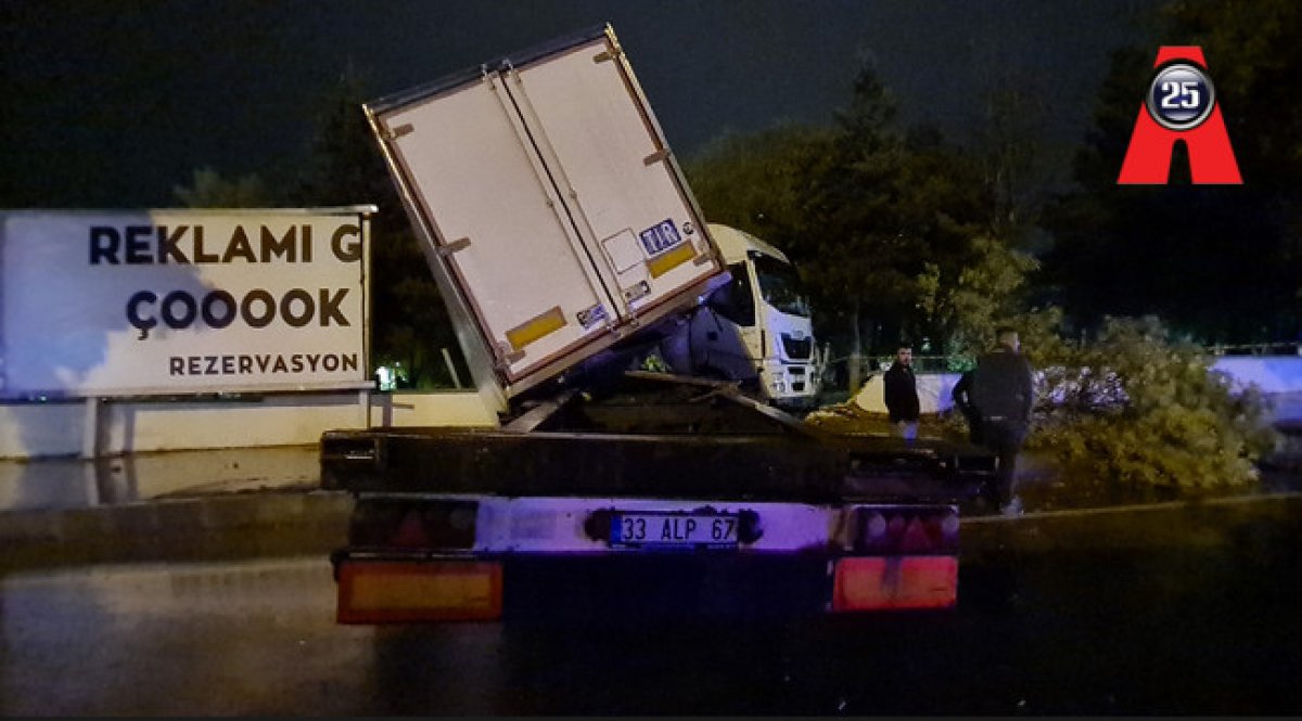 Akşam saatlerinde meydana gelen kazada, 33 ALP 67 plakalı TIR, karayolları istikametinden gelirken hızını alamayıp kontrolünü kaybederek kavşağa daldı.