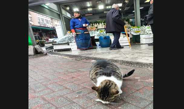 Bir obez kedi; henüz bir yaşında bile değil. Tezgâhların önünde nöbette. Balıkçı, müşterilerin arada bir boş bıraktığı tezgâhtan bir hamsiyi kuyruğundan tutup kediye fırlatıyor. Kedi balığa doğru ağır çekim yürüyor. Sırtını tezgâha dönüyor. Yayalara aldırış etmiyor, korkmuyor. Ya oralarda doğdu ya yavruyken oralara bırakıldı.