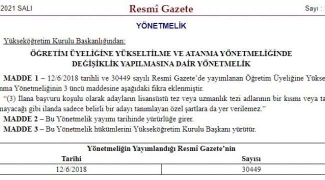 "Bu kapsamda yükseköğretim kurumlarımızın akademik kadro istihdamında 'liyakat ve fırsat eşitliğini' artırmak amacıyla 'Öğretim Üyeliğine Yükseltilme ve Atanma Yönetmeliği'nde yaptığımız düzenleme bugün Resmi Gazete'de yayımlanarak yürürlüğe girdi. Yaptığımız bu çalışma neticesinde; Profesör, Doçent ve Doktor Öğretim Üyesi kadrolarının özel şartlarında adaylara ait tez/uzmanlık tezi adlarının bir kısmı veya tamamı yazılamayacak. Ayrıca, ilanın özel koşulunda belirli bir adayı tanımlayan özel şartlara da yer verilemeyecek. Belirli bir adayı tanımlayan özel şartların öğretim üyesi alımlarındaki atama ilanlarında yazılmasını engellemeyi hedefleyen ve 'fırsat eşitliğini, rekabet ve kaliteyi önceleyen' bu düzenlememizin yükseköğretimimiz ve akademisyen adaylarımız açısından hayırlı olmasını dilerim."